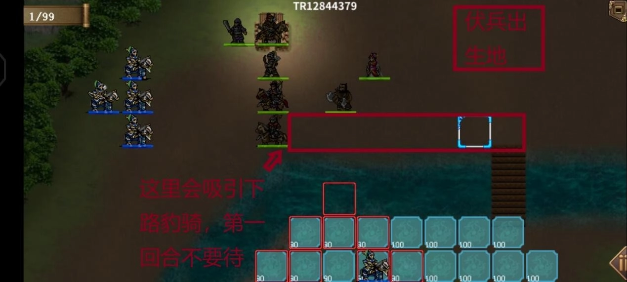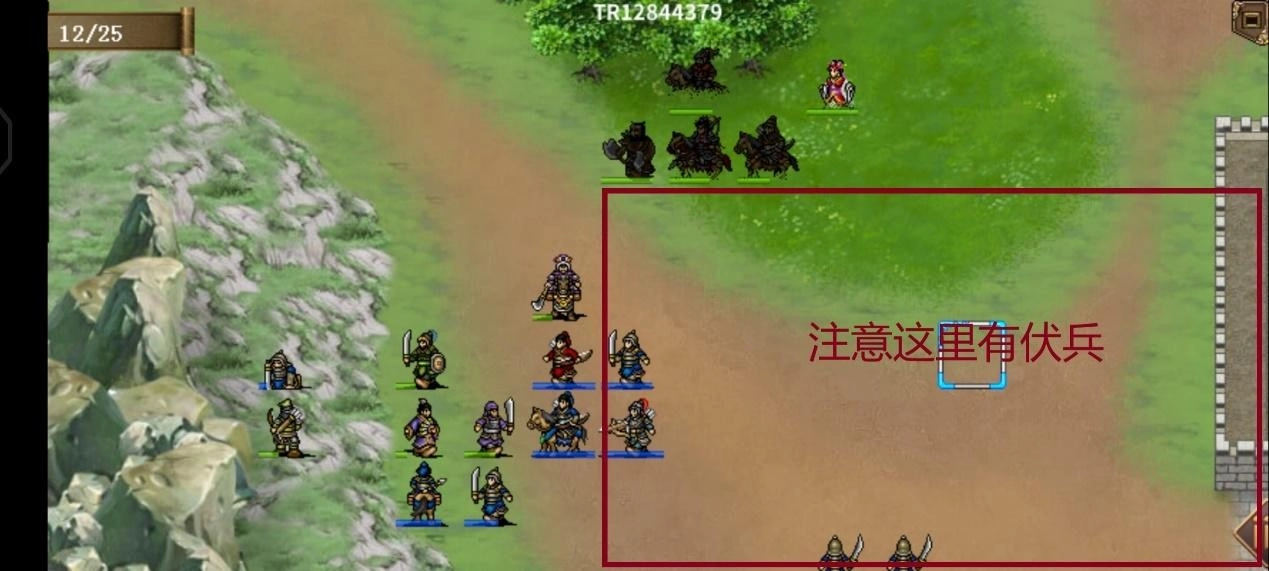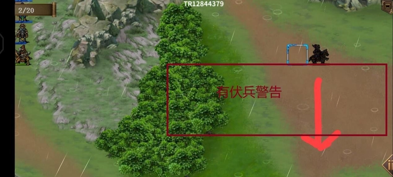 ①我军或友军抵达(8.0-0.19)时,两侧会冒出伏兵(各6名山贼),敌军回合结束后,后方会出现伏兵(4名山贼和4名武术家)。(见下图)