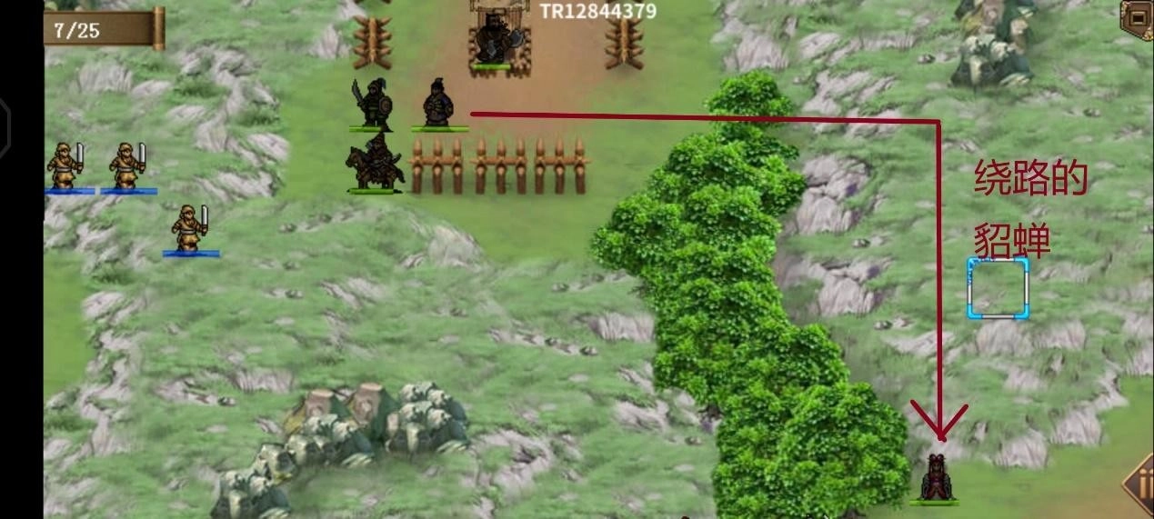 过关流程:这关开局按我的站位,让魏旭去关羽那边堵住;到下一回合时,三个人分别堵住三个位置,具体可参照图示。