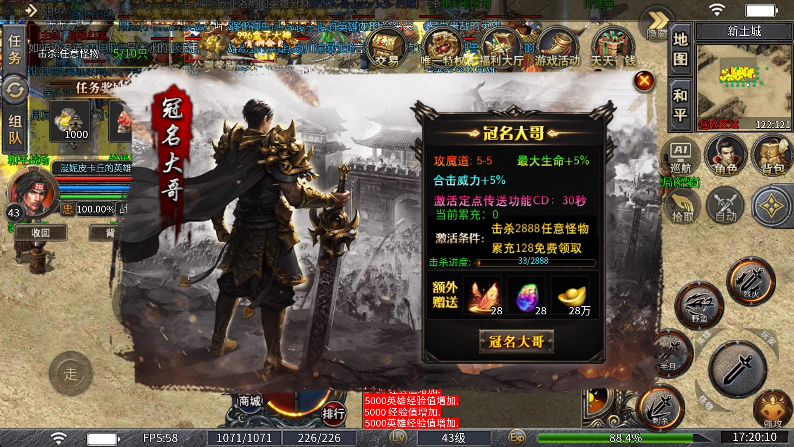 冠名大哥:击杀2888只任意怪物即可免费激活,激活后可获得定点传送功能,同时合击威力提升5%。