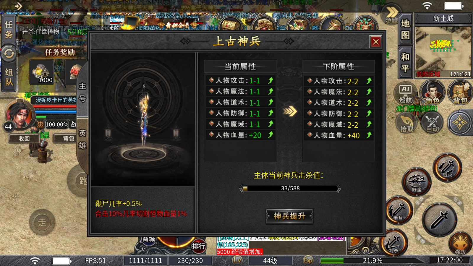 上古神兵:玩家可通过击杀怪物等途径积累神兵击杀值,每提升一次都能获取极为全面的属性加成,此外合击时还有10%的几率直接切割怪物的血量。