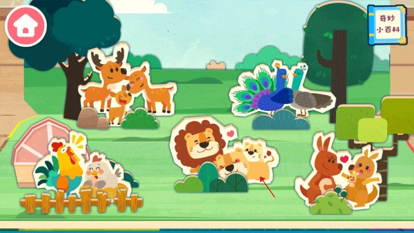 奇妙的动物家庭游戏是一款深受家长喜爱的启蒙教育游戏,它主要向小宝宝展现神奇又有趣的大自然,激发孩子们对世界的好奇心,鼓励他们去探索身边的世界,锻炼逻辑思维能力。家长们还能借助这款游戏,教宝宝认识孔雀、公鸡、袋鼠、狮子等不同小动物,了解它们的名称、外形和生活方式,满足宝宝的认知需求,帮助他们掌握生活常识。另外,游戏后期设置了奇妙小知识问答环节,能更好地加深宝宝对小动物的了解,让他们收获更多游戏乐趣,感兴趣的话欢迎自行体验!