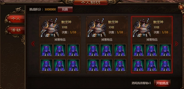 每个副本每日拥有两次挑战机会,VIP角色可享受次数加成。挑战副本会掉落紫色装备与挑战卷轴,而挑战卷轴是挑战个人BOSS时必不可少的消耗道具。