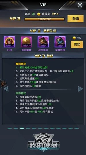 进入游戏后,按照主线剧情推进,就能解锁基础建设内容,包括指挥中心、坦克工厂、直升机场、特种兵营、导弹工厂、仓库、研究所和内矿。这里给个建议,刚开始玩的时候可以考虑充值标配的V1或者V3。V2的性价比也还说得过去,但相比之下还是V3更划算一些。