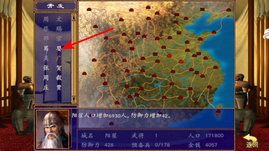 在开发界面点击对应的武将,这是指派武将执行城池开发任务的操作,操作完成后能够提高城池的人口数量或者增强其防御能力。