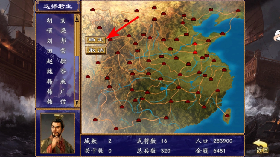 在选定君主后点击确定按钮,此操作用于确认君主的选择,点击完成后便能进入所选势力对应的游戏地图界面。