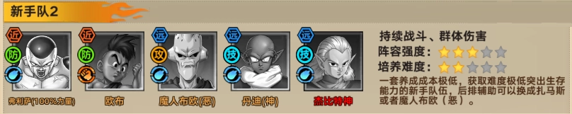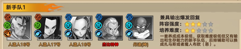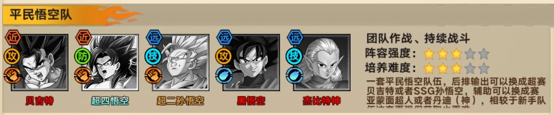 这套阵容的特点在于能很好地适配团队协作与长时间作战的需求,是平民玩家可以考虑的悟空系搭配;到了游戏后期,还可以把后排的输出角色换成超赛贝吉特或者SSG悟吉塔,辅助角色则替换成赛亚蒙面超人或丹迪,不过它的培养难度会比纯新手向的队伍稍微高一些。