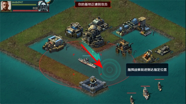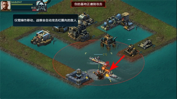 调整战舰的行进路线,把它布置到红色攻击区域内,借助战舰的自动攻击功能,对目标单位展开反击。
