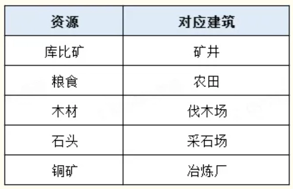 下面是基础资源及其对应产出建筑的列表,玩家可以直接查看。