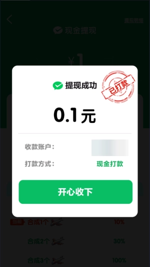 合成出飞机后会获得一次提现机会,接着就能直接发起提现操作,此次提现成功到账了0.11元。