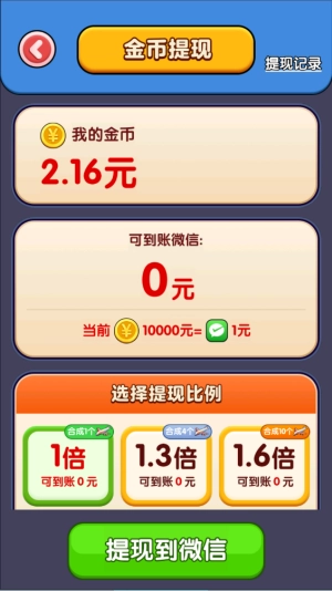 游戏里能拿到金币奖励,可按万分之一的比例兑换提现,而且合成的飞机数量越多,提现比例就越高。
