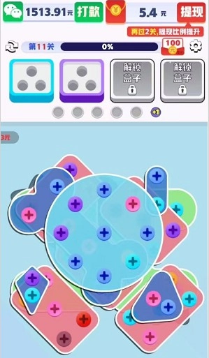 下面的螺丝,只要颜色和上面的盒子相同,凑够三个就能完成消除,完全没有难度。