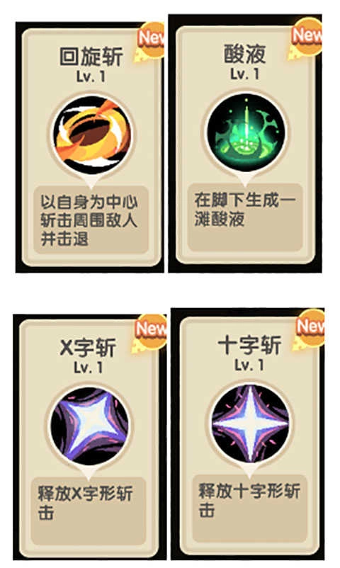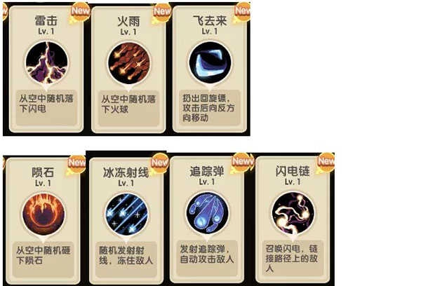 闪电链、追踪弹、冰冻射线、飞去来这些技能都属于自动索敌类型,前期由于攻击范围较大所以比较实用,不过到了关卡后期,它们的伤害会显得有些不够,大家可以根据自己的实际需要来挑选。值得一提的是,冰冻射线还带有冰冻控制的效果,在部分场景中使用起来会相对更顺手一些。