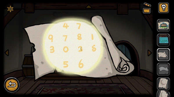 接下来我们要用到这个太阳魔法卷轴,先点击安娜的房间,再点击她桌上的小灯,之后拿出太阳魔法卷轴,会出现一张数字图,这样我们就能发现里面的内容了(是有密码的)。
