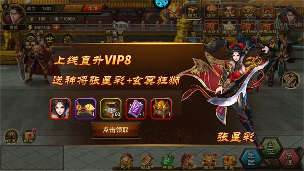 进入游戏后上线直升vip8送神将张星彩+玄冥狂狮