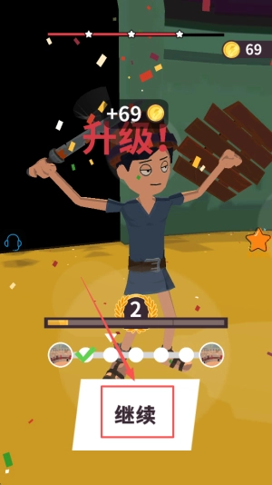 完成升级操作:当界面上出现“69+69”的显示时,先点击“升级”按钮来增强威力,之后再点击“继续”按钮,即可进入下一关进行挑战。