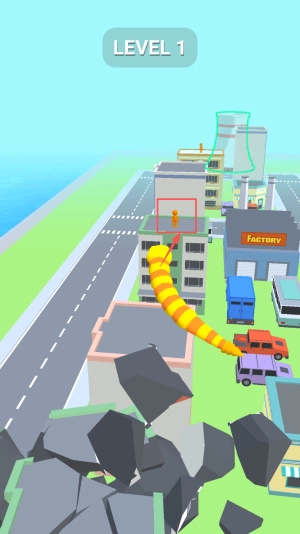 滑动操控贪吃蛇进行破坏:用手指滑动来控制贪吃蛇的移动方向,对准城市里的建筑发起冲击,触发建筑坍塌的效果,以此完成基础的破坏任务。