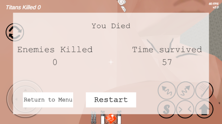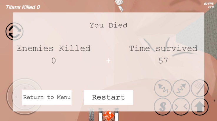 控制角色移动的方式是滑动左侧摇杆,当屏幕滑动至对准墙壁或巨人时,启动钩锁就能起飞,页面最右下角的向上箭头按钮点击后可直接跳转。
