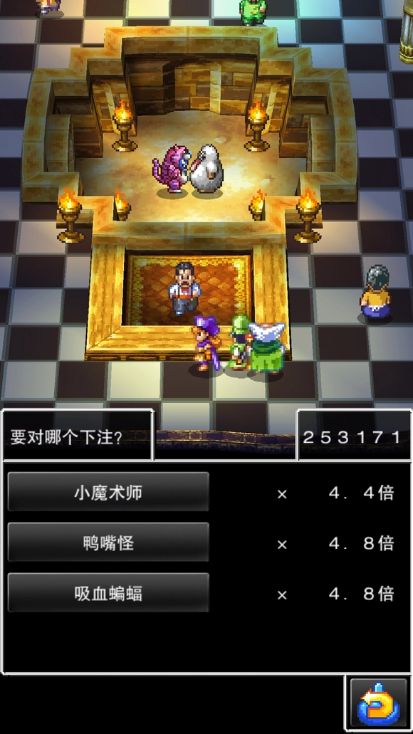 第二章公主抵达赌场所在的城市后,先离开城区,向下移动一格,接着打开菜单暂停游戏,退出游戏后重新进入,读取暂停时的存档,随后迅速进入城区,走进旅店,再进入地下赌场,然后快速跑到左下角的怪物竞技区域,与店员对话,查看出现的怪物组合情况。部分怪物组合一旦出现,其攻击方式以及后续几场战斗的所有攻击模式和战斗结果就会完全固定,这意味着能够确保100%获胜。举个例子:如果读档后第一次与发牌员对话,出现了如下怪物组合: