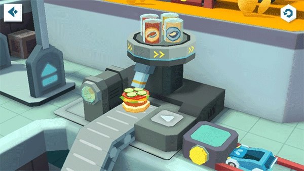 就差最后一步啦——把面包盖加上去,这美味的汉堡就可以完成咯!不过呀,还有一个小小的挑战呢——要通过有趣的弹球桌:宝宝赶紧启动弹跳格,让汉堡进到弹球桌里,滚起来吧!