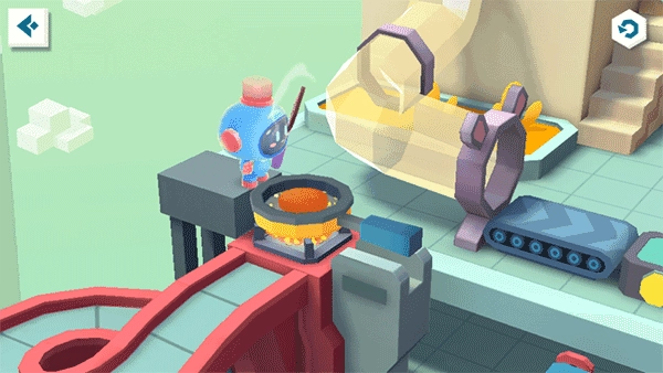 煎锅旁的机器人已经等了好一会儿啦,宝宝快拿起锅铲弹弓,对准煎锅,把生肉块发射出去!你听,肉块在锅里发出滋滋的声响,等它熟透了就能去下一个地方咯。