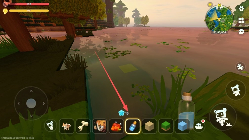2、小玻璃瓶制作完成后,点击该物品,接着走到水域附近,点击水域来使用它。