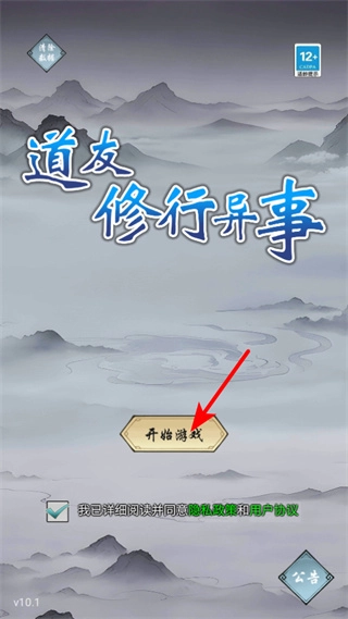 1、在游戏启动界面,勾选相关协议后点击开始游戏按钮,即可进入道友修行的宗门玩法,开启修士养成与宗门建设的基础操作,体验资源积累等相关内容。