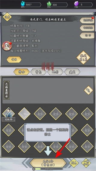 进入宗门界面后,使用随机令能够招募基础修士,以此完善宗门的人员架构。这些修士会参与到宗门资源的生产过程中,比如每日收益的获取,从而为宗门的初期发展提供助力。