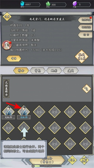 3、当持有两张相同的修士卡片时,点击该卡片即可触发合并功能;合并完成后,修士的境界和属性将得到提升,这不仅能增强其在宗门内的作用,还能进一步提升宗门的整体战力。