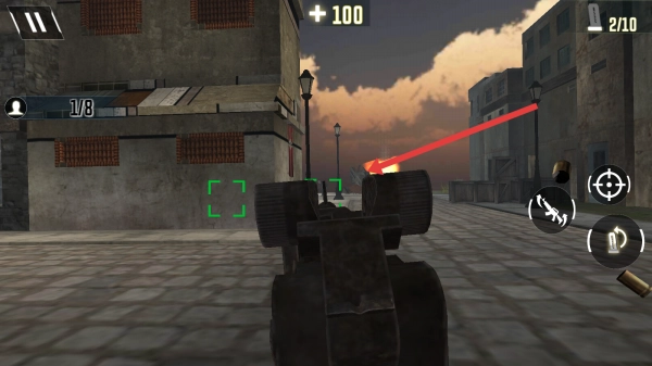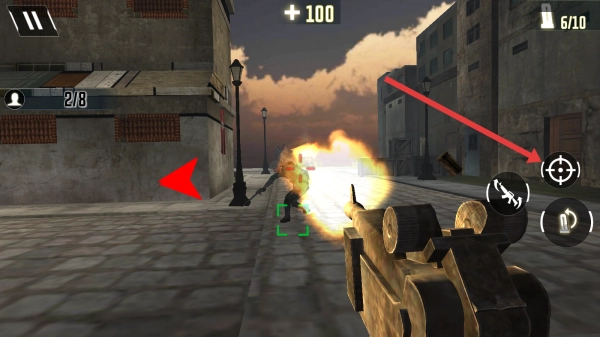 1、战斗时,通过虚拟摇杆调整自身位置,利用右侧按键进行射击与切换武器;当发现敌方入侵时,点击瞄准并向敌人发起攻击。