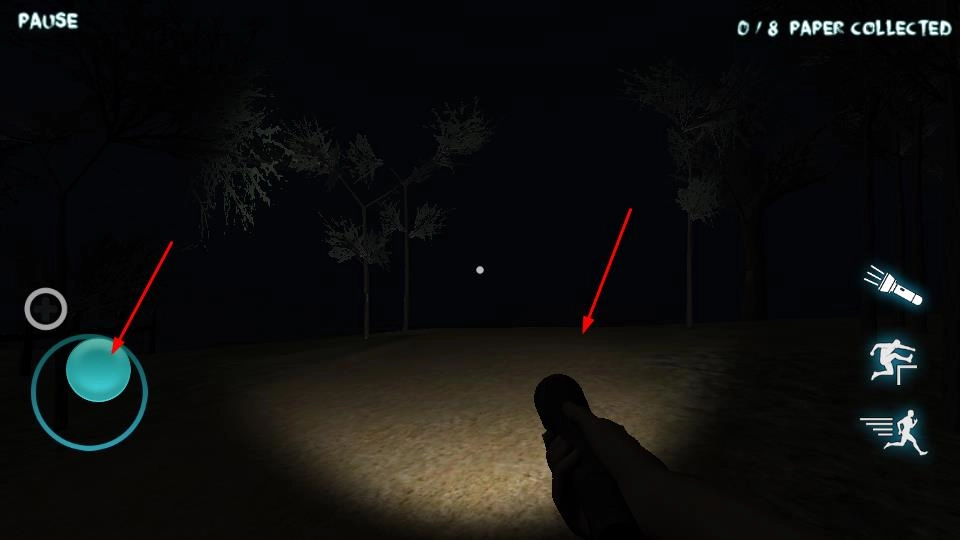2、游戏过程中,左侧的虚拟摇杆是探索的核心操作键,轻触并滑动它就能控制角色的移动方向;右侧的功能按键则具备切换手电筒的功能,开启手电筒可照明并驱散迷雾,此外点击奔跑图标还能调整角色的行动速度。