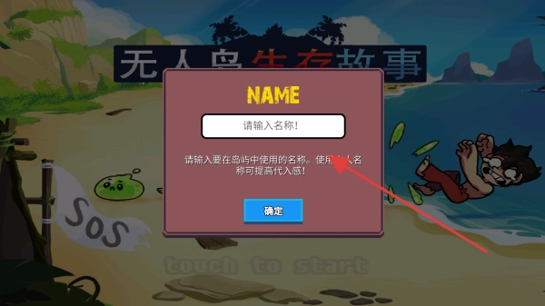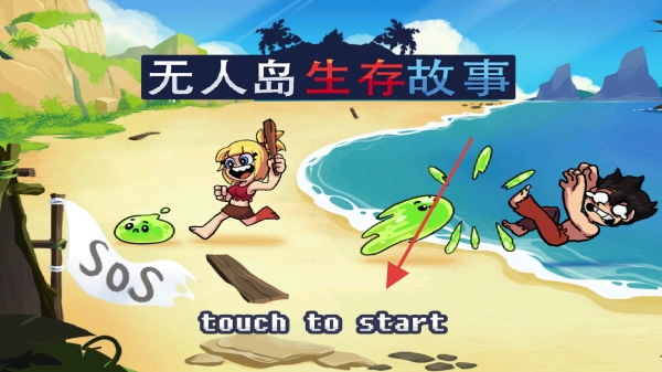 1、进入游戏的无人岛生存故事界面后,点击“touch to start”按钮,即可开启游戏的冒险挑战并进入游戏主场景。