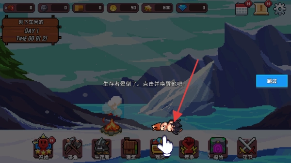 3、按照红色箭头指示的方向,点击处于晕倒状态的生存者将其唤醒,以此完成游戏任务,从而获得游戏得分与奖励,进一步积累游戏资源,助力角色能力的提升。