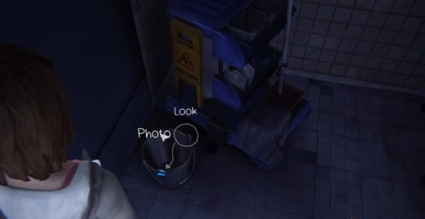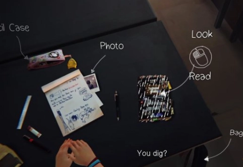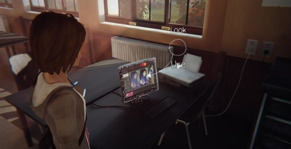 step2.把镜头移到桌案上方,再把鼠标移到加载画册右侧的一张麦珂茜的背影照片上,之后按住鼠标左键,将光标拖到“LOOK(查看)”的字样上,这样麦珂茜就能查看这张照片了(后面所有查看物品、和物品互动、跟别人交谈的操作都按这个方式来)。