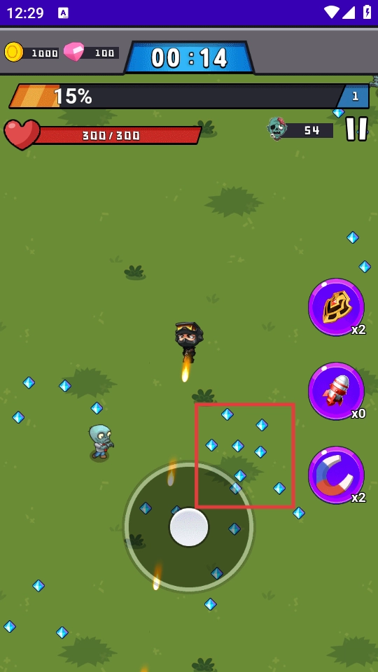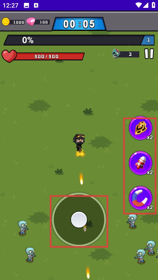2、借助虚拟摇杆操控角色移动,使用右侧的技能道具来抵御僵尸的攻击。