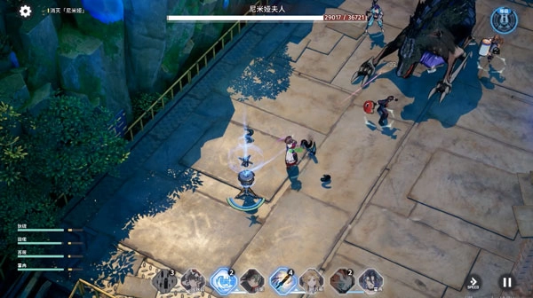 4、举个例子,在一场boss战斗里,boss会轮换使用多种技能对玩家发起攻击,像扇形技能、召唤小怪的技能都有,偶尔还会暂时退出战斗,在场地边缘释放范围技能来攻击玩家小队;而依据角色定位的差异,有的角色要在boss身前扛住伤害、稳住仇恨,有的是在侧面输出的近战职业,还有在后方提供辅助和远程输出的角色,玩家一共能携带四名角色参与战斗。