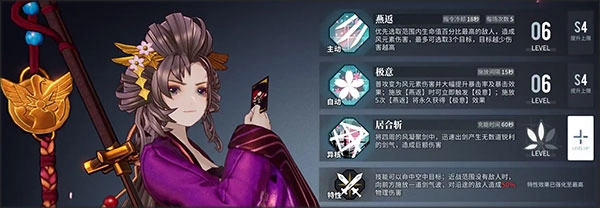 技能方面,一技能燕返会锁定范围内血量占比最高的敌人造成高额伤害,同时额外选取三个目标;不过每多选取一个单位,伤害就会降低20%,即便如此,依托技能本身的强度,实际打出来的伤害依旧很可观。再搭配二技能带来的自身伤害提升与暴击率加成,加上居合斩的大范围群体伤害效果,能让后续的输出能力更上一层楼。
