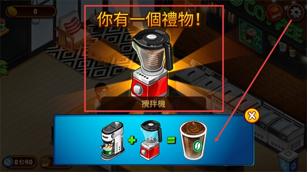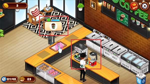 4、在制作场景里,要依据顾客的需求,先操作咖啡机制作基底,接着用搅拌机进行处理,这样就能快速完成订单并获取金币。