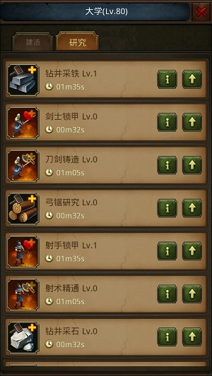 大学的建造地点选在城内的空地块,建造时要消耗相应资源,并且存在一定的等待时长,若使用钻石则能立即完成建造、跳过等待;无论是升级还是建造建筑,在等待过程中都会占用1个建筑位(即空间);当升级所需资源不足时,也可以直接用钻石来替代资源完成升级操作。