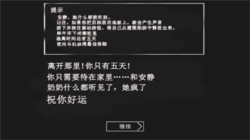 如果能在五天内打开大门逃出去,奶奶就只会追你到门口便停下,接着画面会黑屏一会儿,之后突然闪过奶奶的脸,这一段的惊吓效果还挺强的。