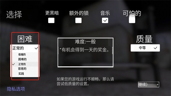 对于初次尝试这类游戏的玩家,建议选择最简单的难度,这样游戏体验可能会更友好一些。游戏里还有个特殊模式,开启后视野范围会大幅缩小,周围几乎都是黑暗,你完全无法预料危险会在什么时候从暗处突然出现。