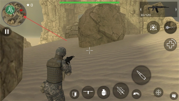 通过左下方的虚拟摇杆操控角色移动,借助小地图来定位敌人的位置。