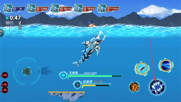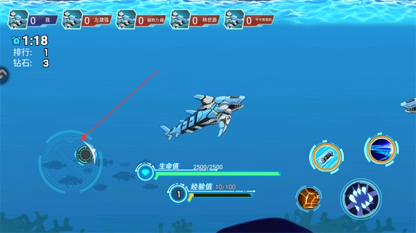 打开游戏并进入排位赛对局后,借助左下角的轮盘来操控鲨鱼的移动方向。