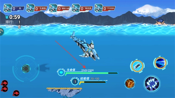 你可以通过观察下方的生命值与经验值在海洋里存活,吞食其他鱼类或者海面上的人类就能恢复生命值。