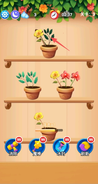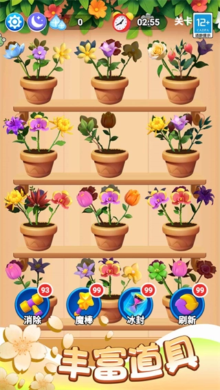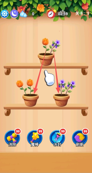 游戏的玩法十分简单:只要把三朵相同的花移动到同一个花盆中,就能完成消除;过程中还会有花瓣动画和悦耳的音效相伴,玩起来格外畅快。