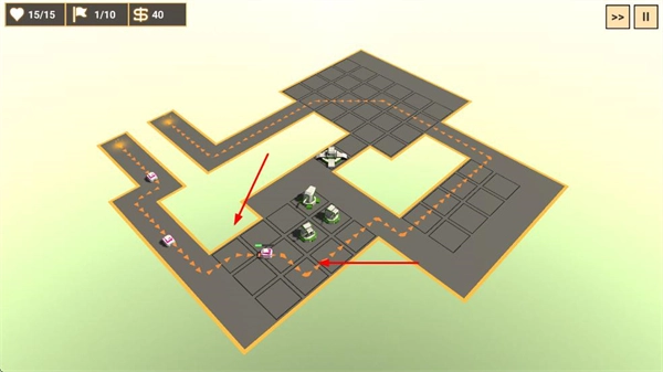 当敌人顺着既定路线袭来时,借助已经布置好的防御塔发起攻击,以阻拦它们通过这条路线。