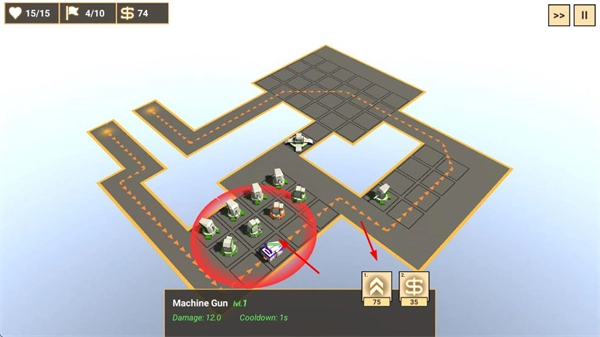 消耗金币升级防御塔,像机枪塔升级后属性会得到提升,这样能增强防御塔的攻击能力,进而提高清敌效率。