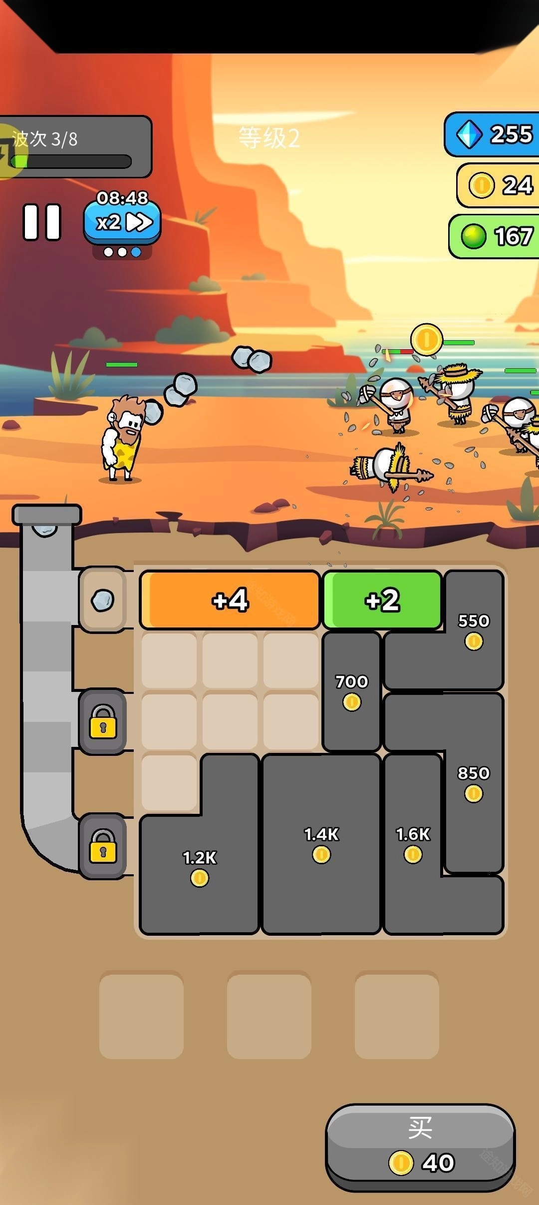 击败敌人后,玩家能获取金币,解锁更多空间用于合并操作。