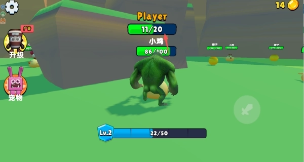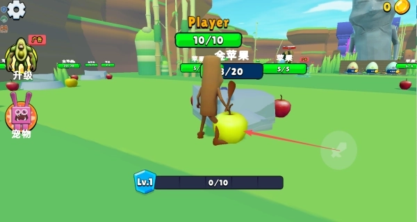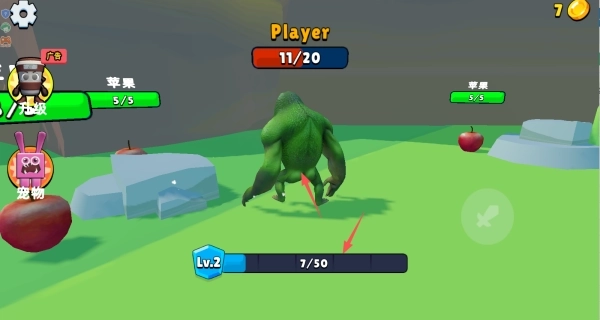 1、进入游戏后,通过点击并拖动屏幕来操控角色在地图里移动,击杀苹果或其他怪物就能提升等级。