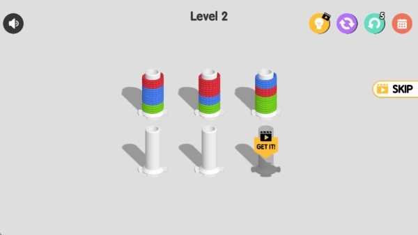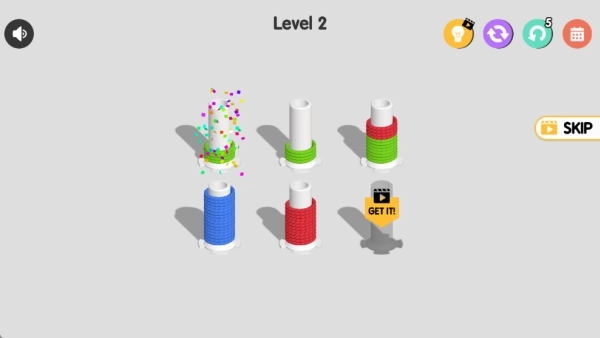 1.颜色分类目标:每一关都会给出杂乱缠绕在一起的彩色毛线,玩家需要通过拖拽或者旋转的操作,把相同颜色的毛线卷绕到对应的毛线筒上。