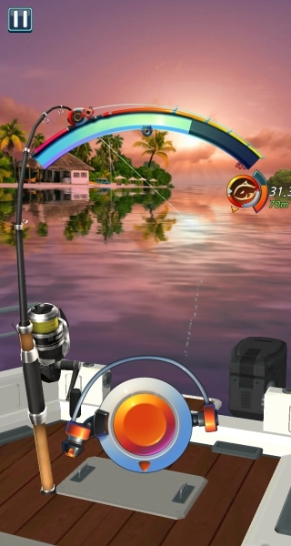 3、持续按住按钮来牵引鱼线,把鱼儿慢慢拉向岸边,借助界面上显示的鱼儿距离,来判断拉扯时的节奏和力度。